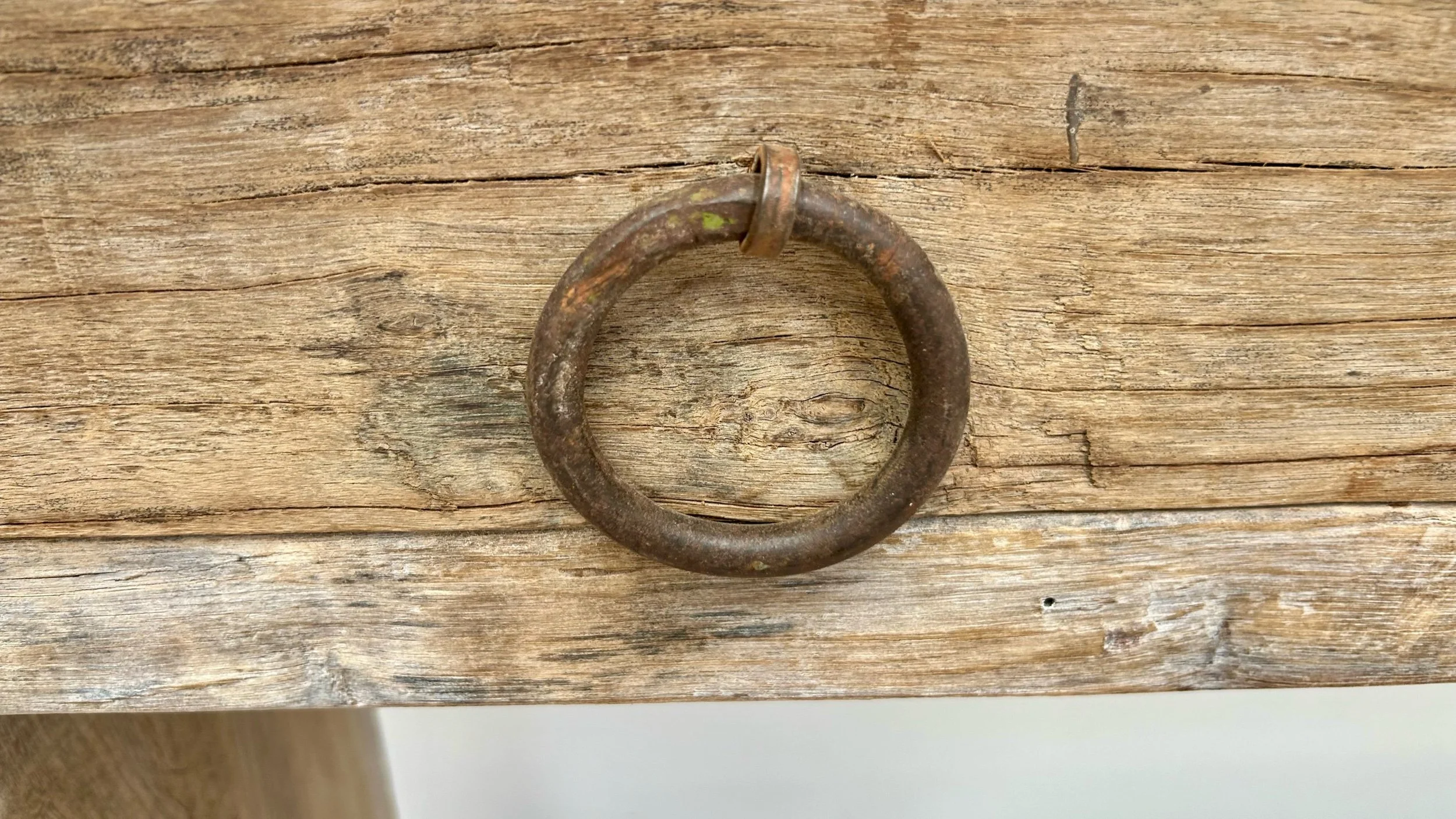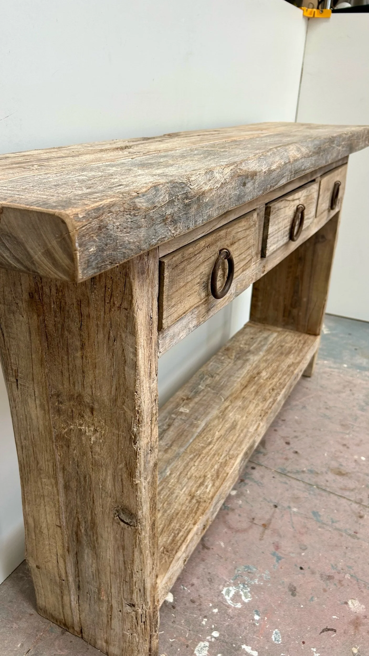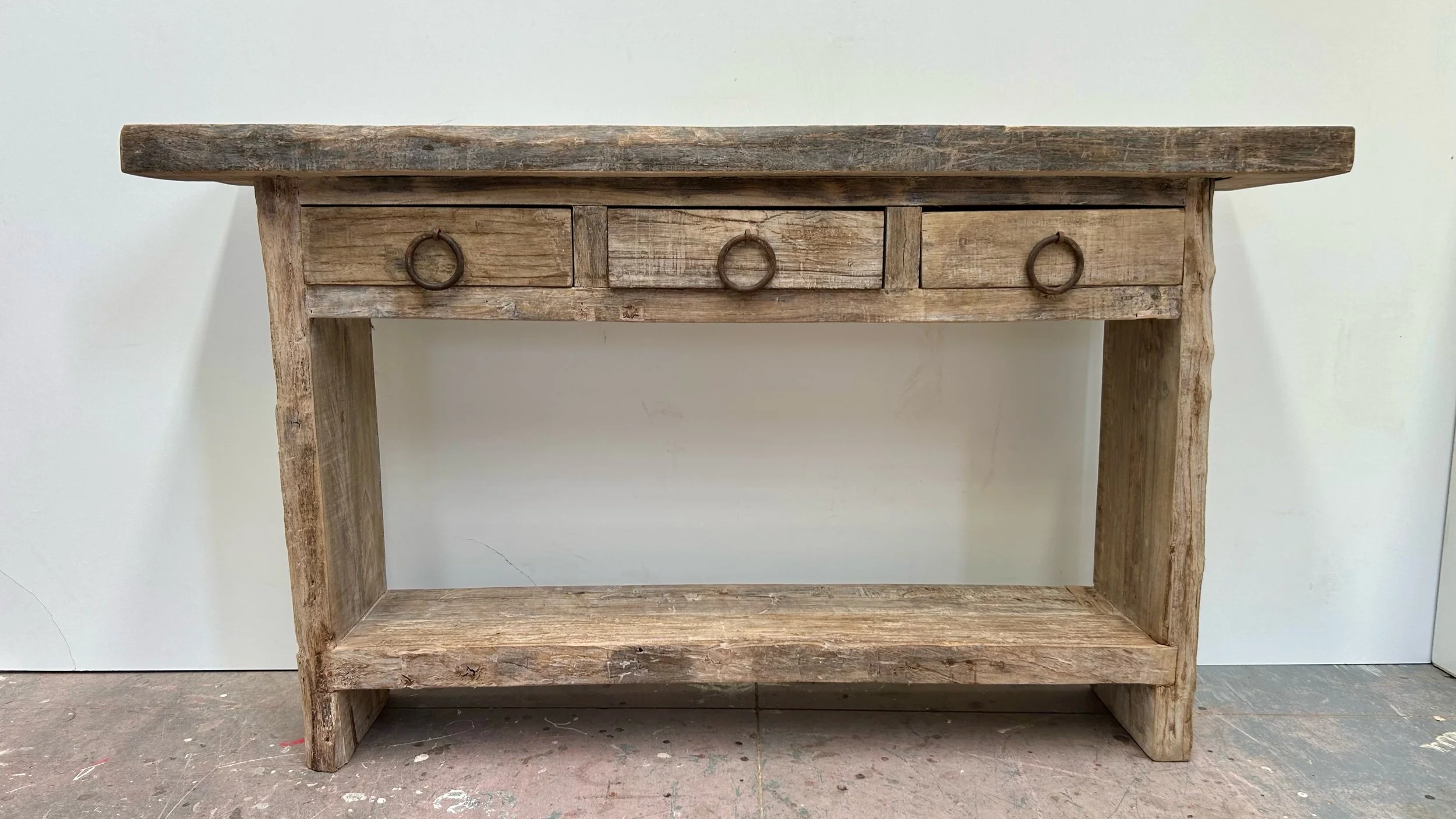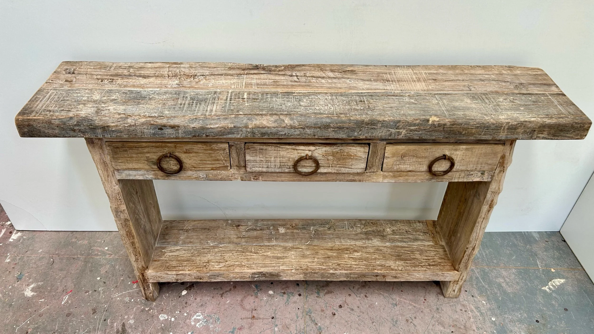 Featuring three drawers with classic ring handles and a spacious lower shelf, it offers both practicality and style. Solid and full of character, it’s perfect for entryways, living areas, or as a statement piece.